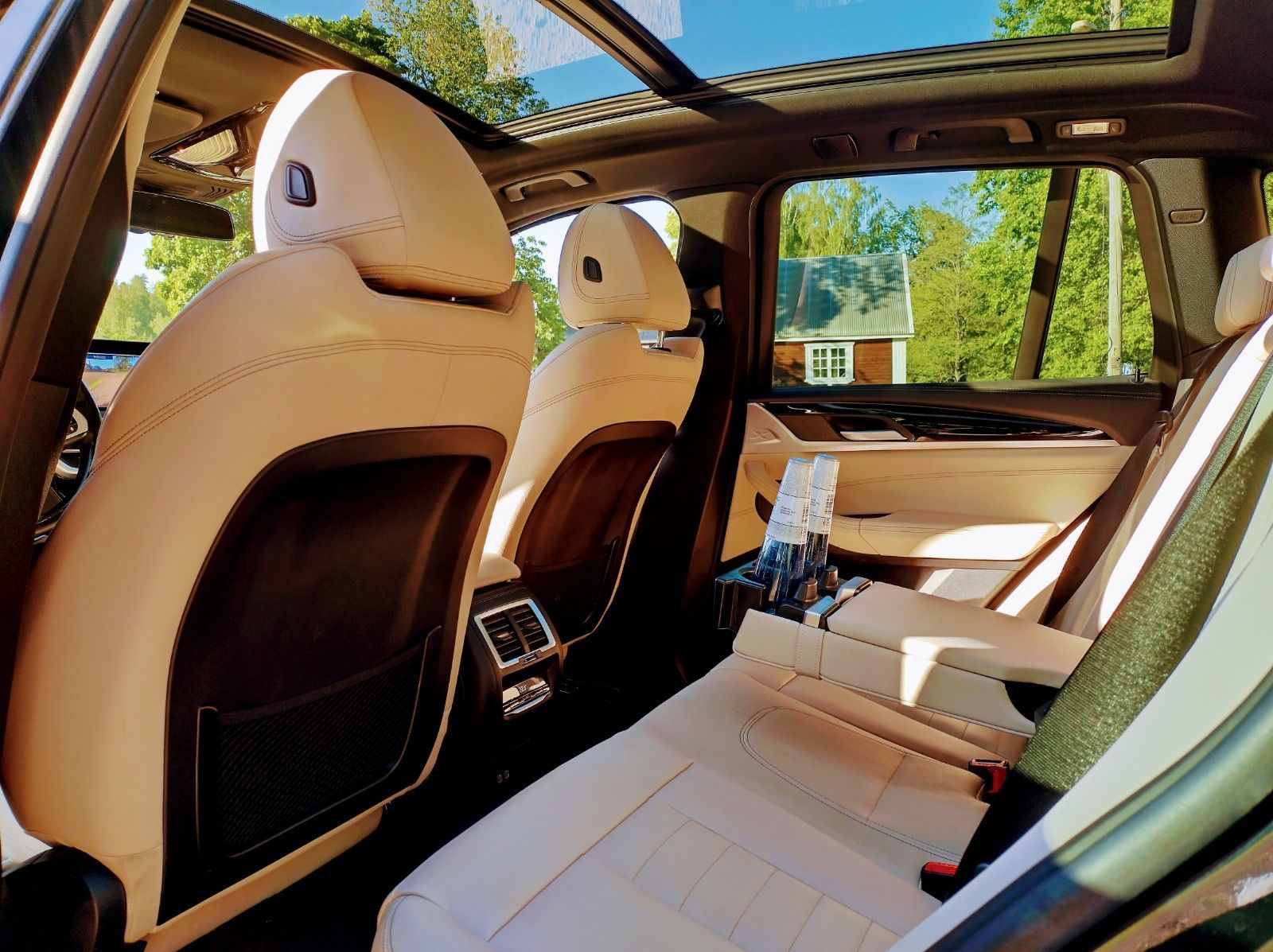 - The car has a navy blue color and décor with light Champagne leather and beautiful wood elements